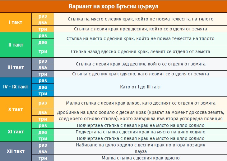 Ако искате да разучите самостоятелно този вариант на хорото Бръсни цървул, може да се опитате да следвате тази последователност от стъпки такт по такт. Хватът е предна плетеница и няма движение на ръцете. Състои се от 12 такта: